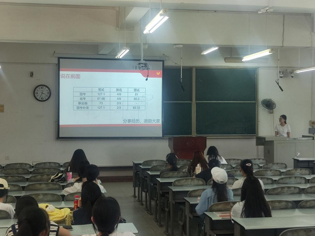 随后,三位优秀就业学生代表结合自身实战经历,带来了针对性极强的经验分享。文盛哲学长聚焦央国企及银行求职,从前期准备、简历优化、笔试重点到面试流程等多个环节,进行了细致拆解与干货分享,为有意向进入银行的同学提供了清晰指引;成功上岸国考的罗恒怡同学与陈文婷同学,则围绕考公备考计划制定、岗位选择策略、备考心态调节等核心问题展开交流,结合备考过程中的常见误区与应对方法,分享了极具参考价值的实战经验。周祥老师对三位同学的分享进行了总结点评,鼓励同学们结合自身情况吸收借鉴,明确求职目标与行动路径。