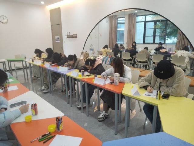 活动在轻松而温暖的破冰环节中拉开序幕。围绕成圈的同学们以“名字+情绪小涂鸦”的方式,用色彩与符号勾勒当下心境,简短介绍中彼此的距离悄然拉近。随后,在带领者的引导下,大家闭目静坐、深度呼吸,伴随着舒缓的背景音乐,渐渐沉潜于内心深处,唤醒属于自我的形象与感受。