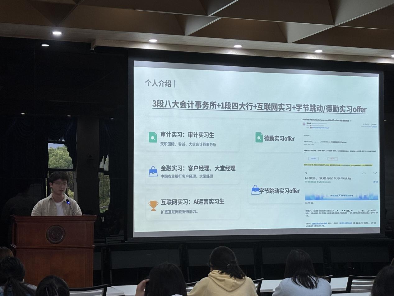 为扎实推进学风建设与就业指导工作,帮助同学们提升实习与求职能力,4月12日,学院举办“学以致用”实习经验现场分享会。本次分享会特邀审计2442班孙宇浩主讲,孙宇浩入学以来专业成绩优异,拥有多家会计师事务所、银行及互联网企业实习经历,斩获多项知名企业实习offer,实战经验丰富。
